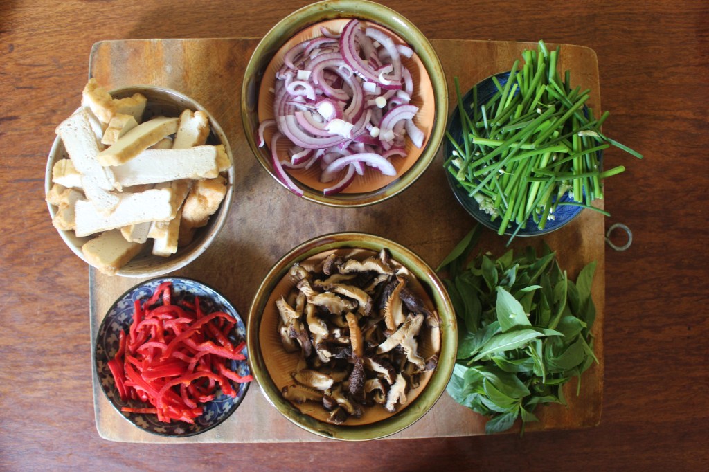 Faire bouillir de l’eau et mettre à tremper les shiitakes (couvrir pour plus de rapidité – il faut au minimum 10 minutes pour les ramollir ).
