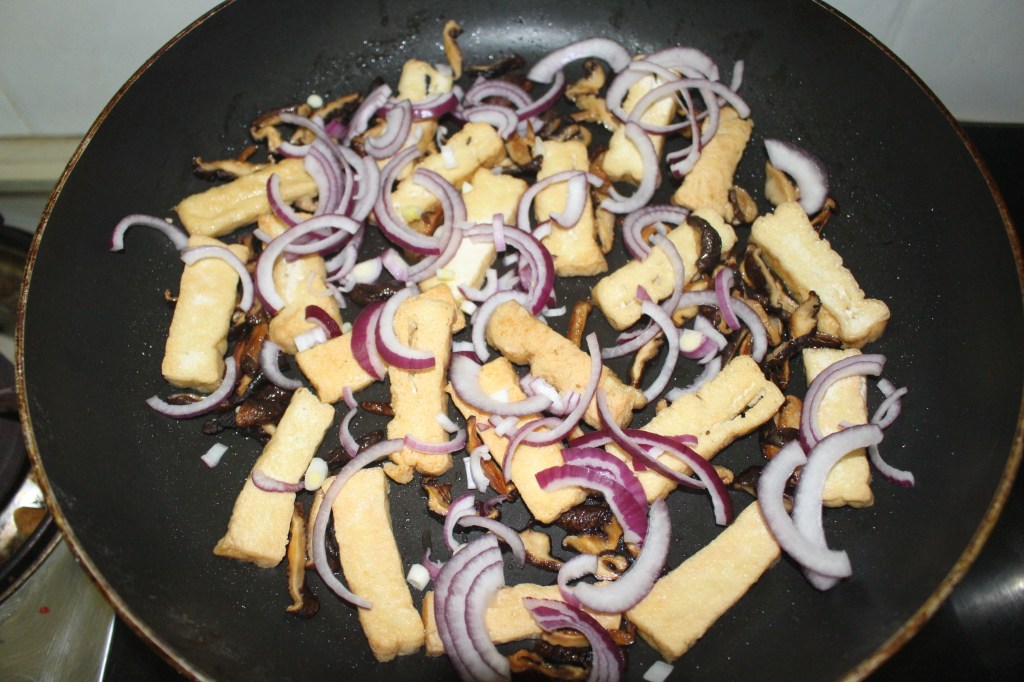 Au bout d’environs 3 mn je retourne le tofu, et j’ajoute les oignons. Laisser cuire encore 2mn en vérifiant que ça ne brule pas, sinon….baisser le feu.