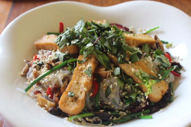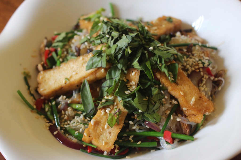 Verser les nouilles en premier dans l’assiette ou le bol, ça vous permettra de mieux gérer pour un partage équitable. Versez le reste, soit en vrac soit en positionnant le tofu sur le dessus, rajoutez le reste du sésame et le basilic thaï ciselé finement.